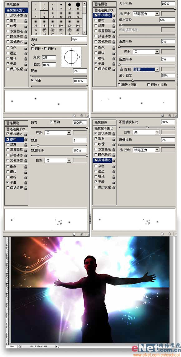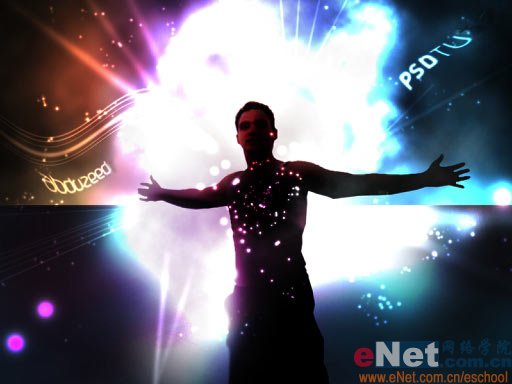 18.最后用畫筆工具做一下設置做出一些散射的光線粒子并輸入文字,最終效果如下所示: