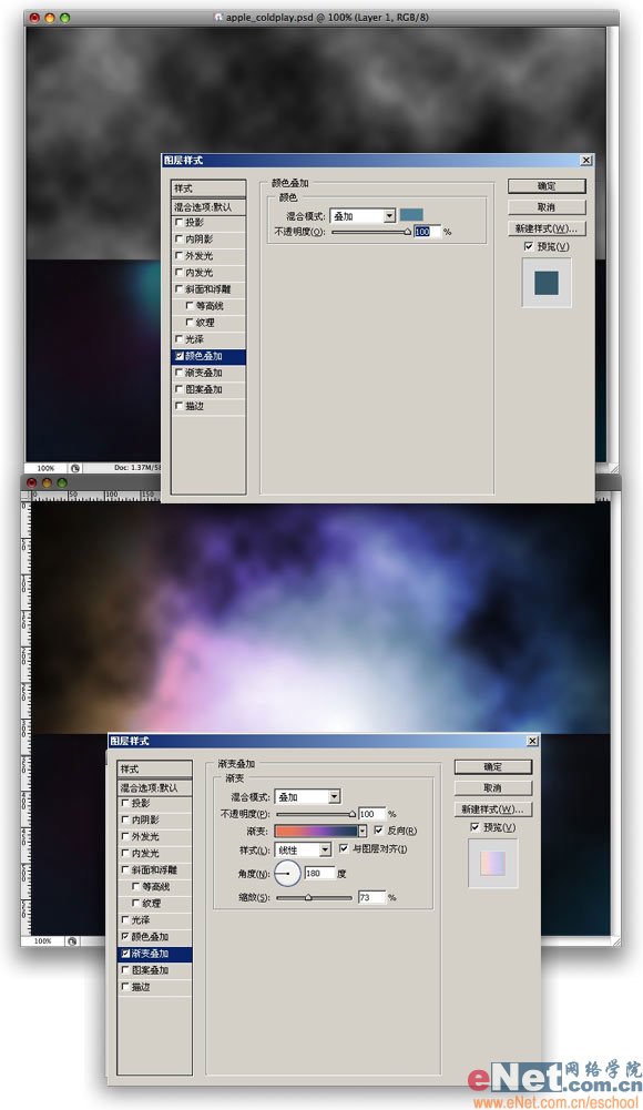 10.下面我們來制作背景的光線。首先建立一個新圖層。設置前景色和前景色分別為50%灰色和純黑色,然后在新圖層中執行濾鏡-渲染-云彩。接下來雙擊該新圖層加入顏色疊加和漸變疊加圖層樣式,設置如下圖所示: