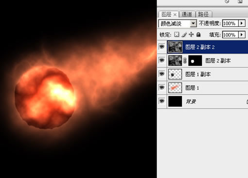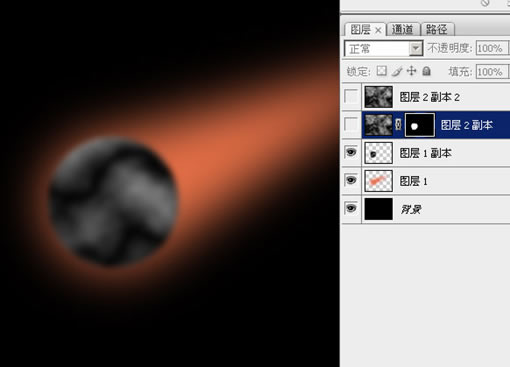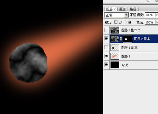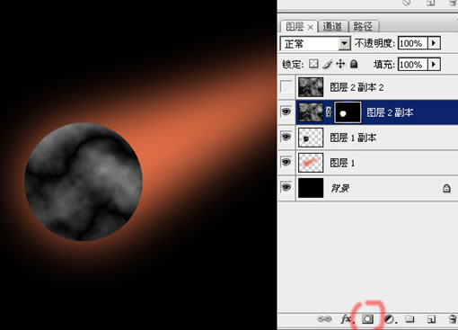 14、選中圖層2副本的蒙板,然后用實心的黑色畫筆,在圓形的邊緣稍加涂畫,把它修成不太規則的形狀: