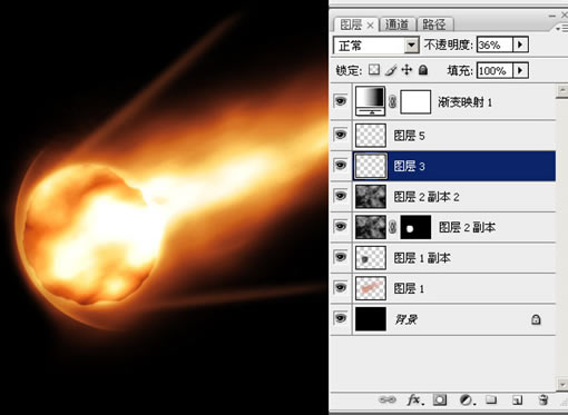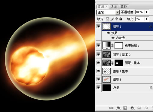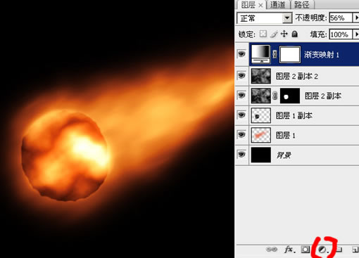 17、如果你做的沒什么大問題,運氣還好的話,可以看到大概的樣子已經出來了。這時候可以在最上面加一個 “漸變映射” 層,調整出一種火焰的感覺來:
