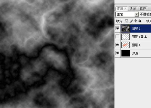 18、這時候你可以調整各層的明暗,以取得一個比較好的效果。 說實話效果要看剛開始那個云彩層的情況有一定隨機性,不過你可以手工修飾各個圖層獲得較好的效果(包括使用涂抹、變亮、變暗等工具)