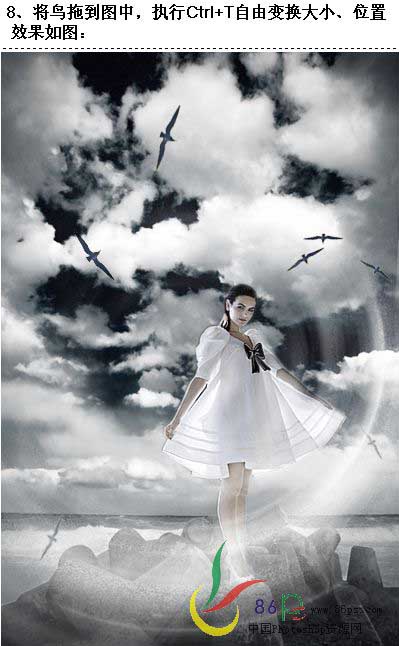 | 7、打開素材3,把海鷗勾出來。 8、把勾出的海鷗拖進來,然后復制幾分,適當的調整大小和角度,效果如下圖。 |