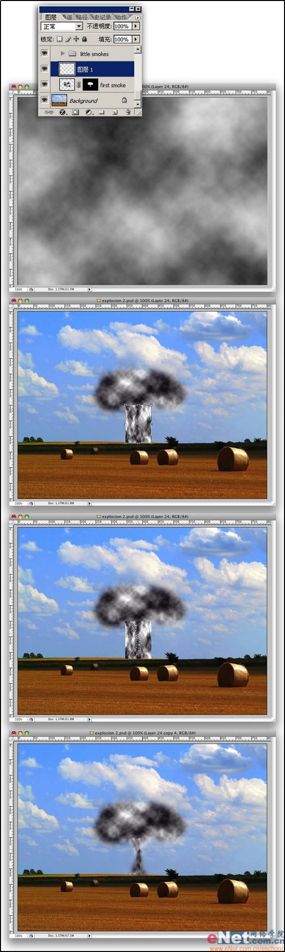 5.在最上層建立一個新的圖層文件夾,命名為"little smokes."然后在這個新文件夾中建立一新圖層。我們一會將在這個新文件夾中分別建立3個不同形狀的“蘑菇云”的“蘑菇柱”。