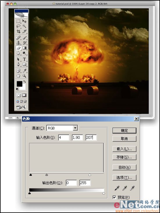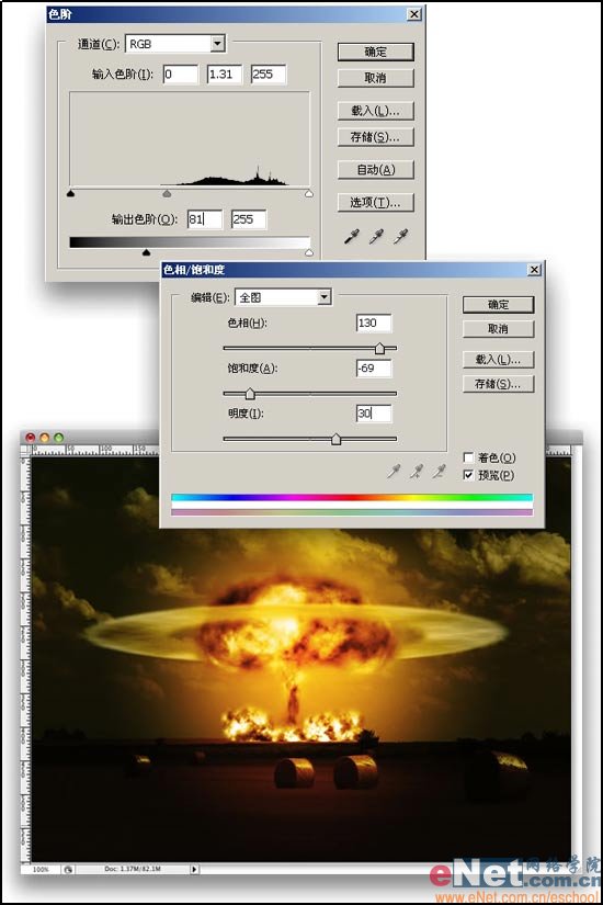 18.現在執行圖像-調整-色階,然后在用圖像-調整-色相/飽和度進行調整。