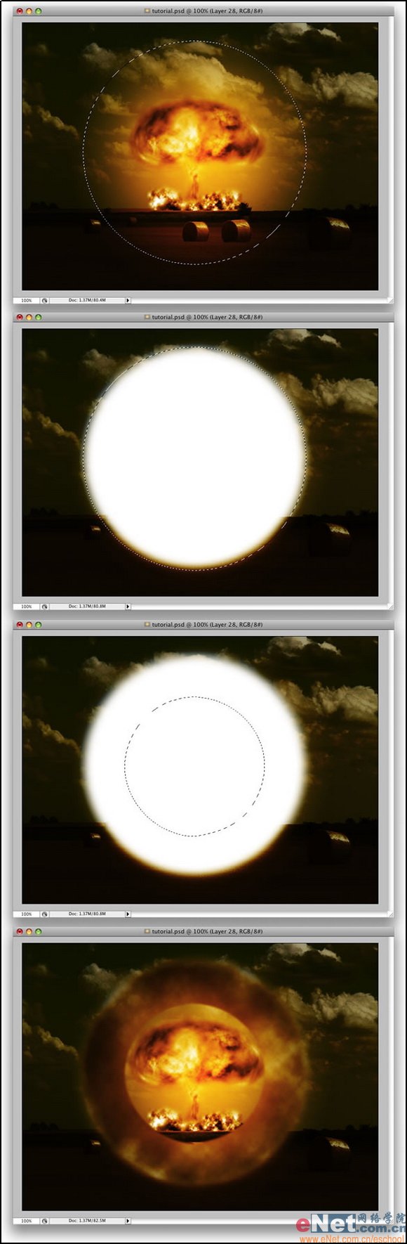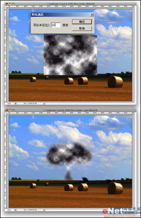 16.最后我們再來制作擴散開來的蘑菇云。選擇工具箱中的橢圓選框工具、設置羽化數值為20像素。建立一個正圓選區并用白色填充。