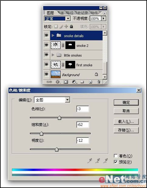 現在回到背景層上。然后在其上面執行圖層菜單中的圖層-新調整圖層-色相/飽和度,設置如下所示: