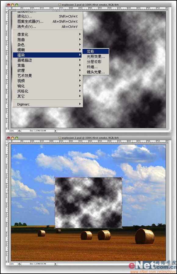3.建立一新圖層。務必將前景色設置為白色,背景色設置為黑色。然后執行濾鏡-渲染云彩。云彩制作完后我們用ctrl+t自由變換命令調整它的大小,方便為后面的爆炸效果添加更多的細節。