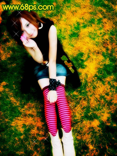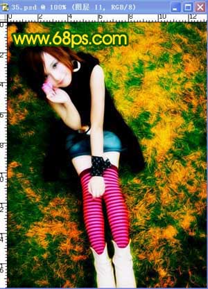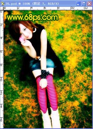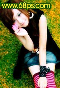 <圖7> 7、新建一個圖層,蓋印圖層,執行:濾鏡-模糊-高斯模糊,數值為3,確定后把圖層混合模式為疊加,然后用蒙板將人物擦出(這一步主要是增加草地的美觀度,不對人物做處理),效果如圖8。