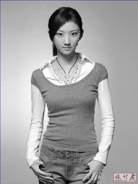 1、打開黑白照片,將圖像模式轉換為rgb,用選擇工具將人物皮膚部份選擇起來,如圖所示: