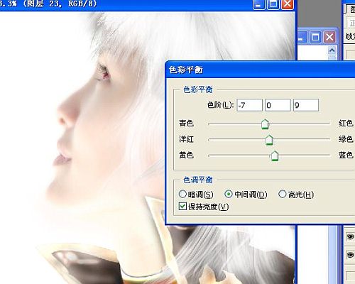 第七步:下面我們開始調膚色,在最上層新建一層。然后按下ctrl+shift+alt+e蓋印可見圖層。用魔棒工具,容差為22選取皮膚。不小心選到旁邊的衣服和頭發也沒關系,不礙事,然后羽化20左右,用曲線把皮膚弄白一點,再用色彩平衡加點在中間調青色和藍色,讓皮膚顯得通透嫩嫩的感覺。