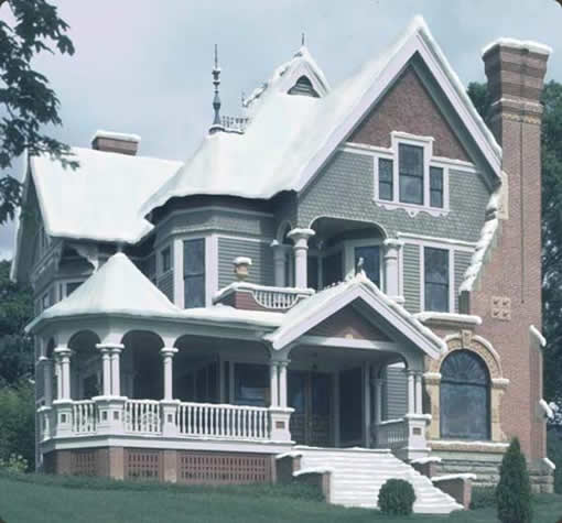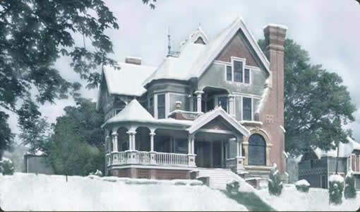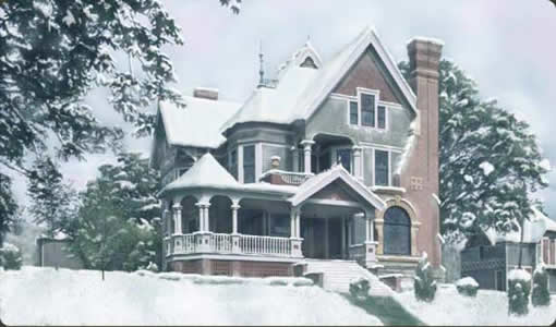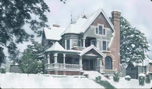 創建一個新層,現在我們要把草地變成雪地,我使用了一個不規則的筆刷,使基層不完全包括在內,通過淺藍色和白色的細微搭配來模擬一個草坪起伏效果,草坪也不要全被雪覆蓋住,適當露出一些,比如大門前的走道。我們可以用同樣的方法在灌木和樹上加雪。