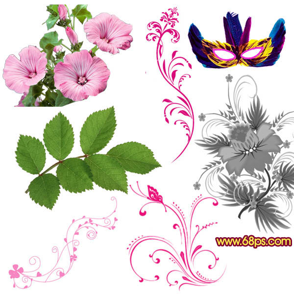 3、打開圖4所示的素材,用魔術棒勾出來,然后分開,依次拖進來,部分的花紋需要改變圖層混合模式及加點陰影,花紋的色彩可自己任意設置。大致效果如圖5。