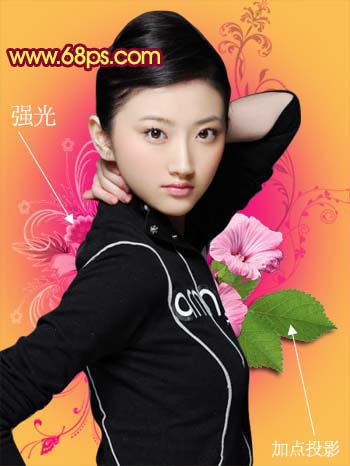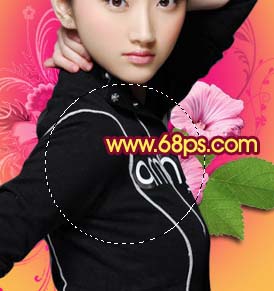 4、在人物圖層的下面新建一個圖層,圖層的混合模式改為“柔光”,然后用橢圓選框工具拉出圖6所示的選區,按ctrl + alt + d羽化,數值為15,填充顏色:#ea0d76,效果如圖7。