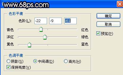 ⒌、創(chuàng)建一個(gè)圖層,蓋印圖層,按ctrl+b調(diào)色彩平衡,數(shù)值如下圖。