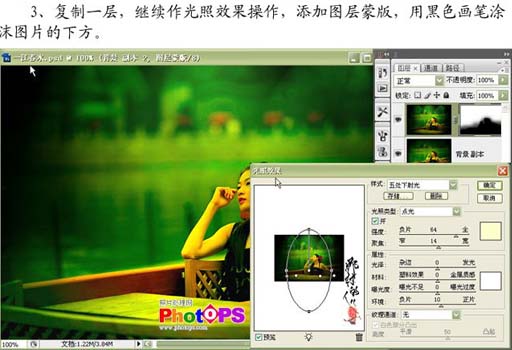 | 3、復制一層,繼續做光照效果,參數設置如下圖,確定后加上圖層蒙版,用黑色畫筆涂抹圖片的下方。 |