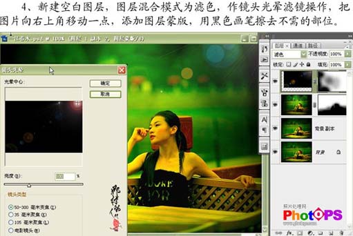 | 4、新建一個空白圖層,圖層混合模式改為“濾色”,執行:濾鏡 > 渲染 > 鏡頭光暈,參數設置如下圖,把圖片向右上角移動以點,加上圖層蒙版,yoga黑色畫筆擦去不需要的部位。 |