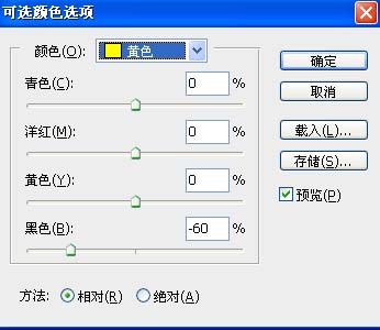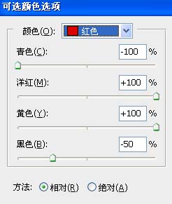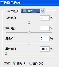 第六步、仍舊是“可選顏色”調整層,參數設置如下,在蒙板中填充黑色,將人物頭發部分擦出。