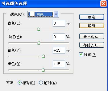 第五步,緊接著再建立一個“可選顏色”調整層,參數設置如下,這次的對象換成人物,在蒙板中只保留這部分,可以先填充黑色再用白色擦出,或者按住ctrl鍵點擊第四步調整層的蒙板,反選后在這一步的蒙板中填充黑色。