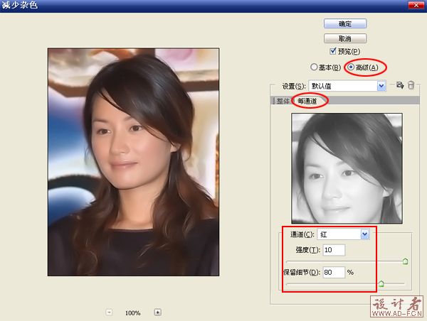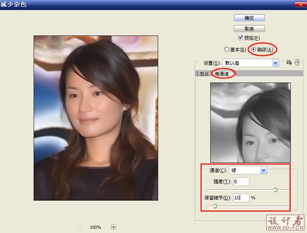 2、執行濾鏡-雜色-減少雜色,選擇高級,每通道,具體參數見下圖。