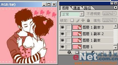 三、復制背景圖層三次,在相應的圖層上復制并移動心形,得到四個圖層[圖2],依次增加一顆心[圖3];