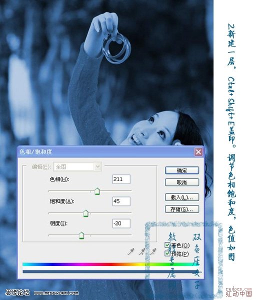 2、新建一個圖層,按ctrl+shift+alt+e蓋印圖層,把前景設為藍色,ctrl+u調整色相/飽和度,勾上右下角的“著色”,如下: