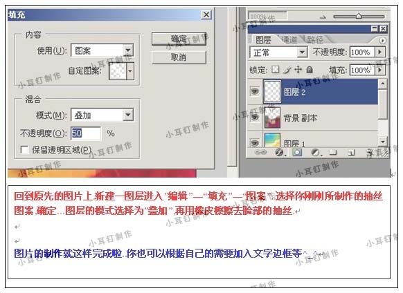 回到原來的文件,新建一個圖層,選擇菜單:編輯 > 填充,選擇剛剛定義的圖案,參數設置如下圖,確定后,用橡皮工具把人物臉部位置擦出來,完成最終效果。