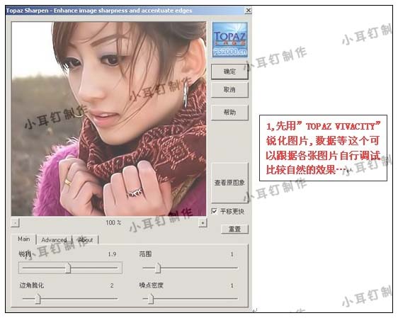 1、打開原圖,先用topaz濾鏡銳化一下,參數設置如下圖。