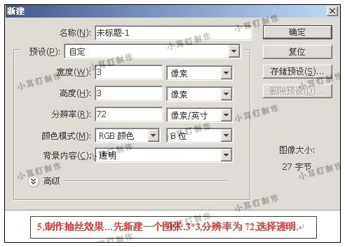 5、制作抽絲效果,先新建一個圖3 * 3像素,背景為透明,參數設置如下圖。