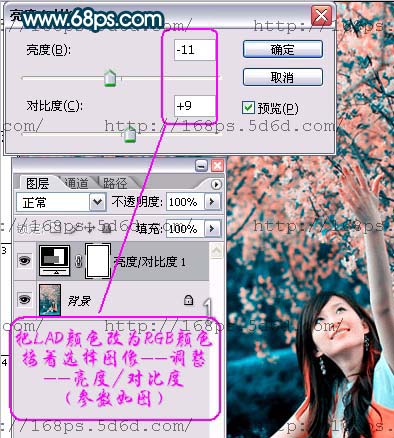 5、選擇菜單:圖像 > 模式 > rgb顏色,確定后創建亮度/對比度調整圖層,參數設置如下圖。