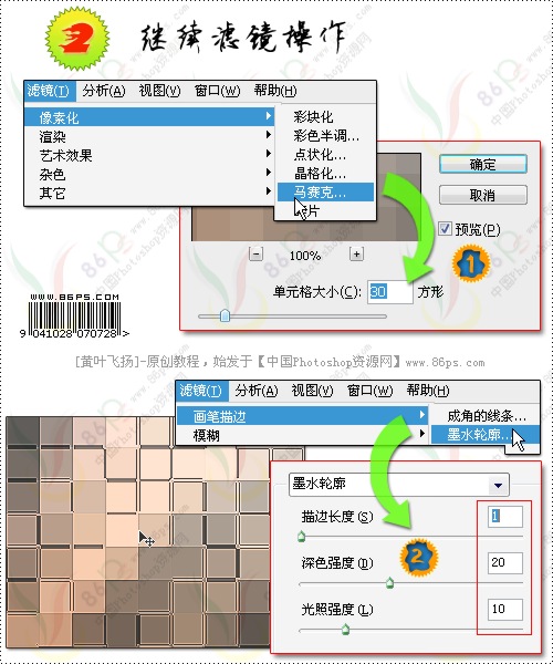 執(zhí)行“濾鏡” -->“像素化” -->“馬賽克” (單元格大小:30)點擊“確定”后,接著執(zhí)行“濾鏡” -->“畫筆描邊” -->“墨水輪廓” (數(shù)值:1、20、10),效果差不多了