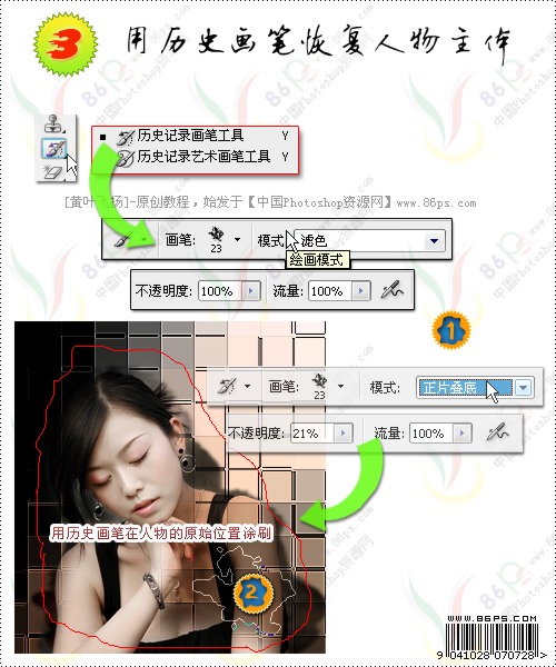 選擇“歷史記錄畫筆工具”,接著在選擇一個自己喜歡的畫筆,我選擇的是“粉筆23”接著把畫筆直徑改為“125”,在人物主體部分隨意刷涂著,就可以把人物恢復出來了如果覺得畫筆的直徑太小不方便使用,可以按住“]”增大直徑,反之則按住“[”縮小;另外在畫筆的使用中適當?shù)母淖兝L畫模式和不透明度或流量可以得到很多不同效果!