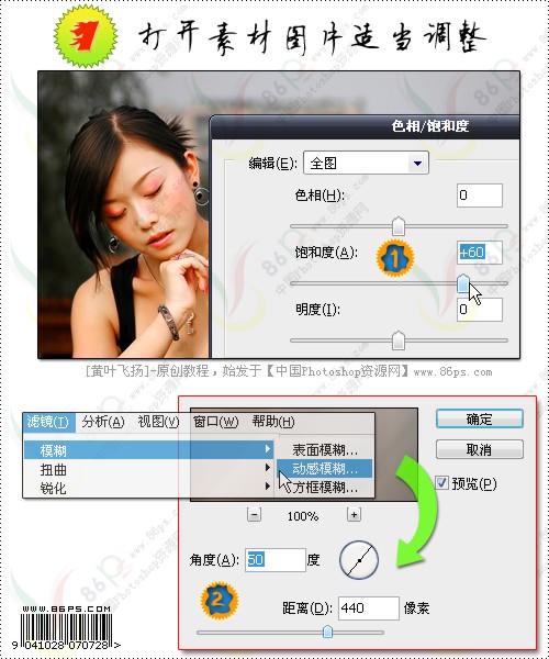 接著執(zhí)行“濾鏡” --> “模糊” --> “動感模糊”(角度=50° 距離=440像素)后確定。