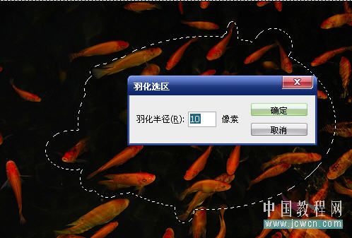 1、將剛才處理的主體素材最小化,打開很多魚的那張素材,使用橢圓選區工具配合加選做出下圖選區,并羽化10像素。