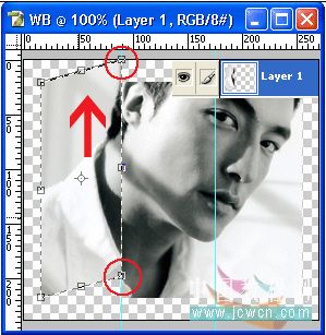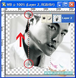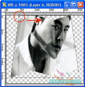 4、選擇圖層1,編輯-變換-扭曲,鼠標(biāo)依次向上拖拽圖中紅圈位置