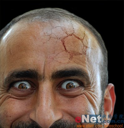 第二十一步:你可能已經注意到“褶皺皮膚”的高光部分和整個圖像的光照并不符合,我們需要對其進行修飾。我新建了一個圖層,使用【吸管工具】選擇臉部皮膚的顏色,然后使用透明度較低的柔性畫筆進行涂抹,覆蓋掉高光部分。如果對剛才繪制的效果不滿意,可以為該層添加圖層蒙版就行進一步的修飾,效果見下圖。
