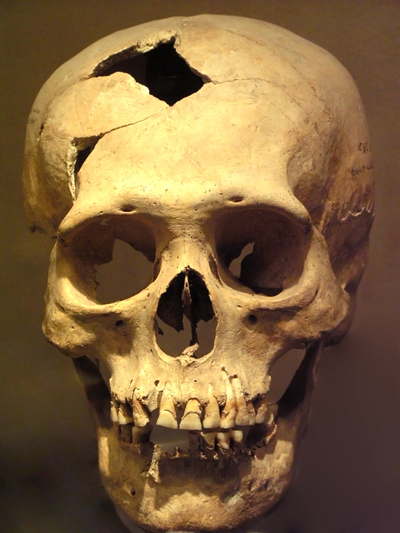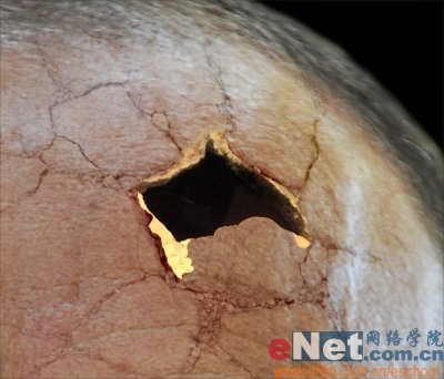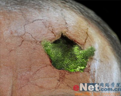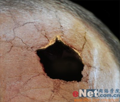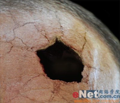 第五步:下面我們要在人物的頭上加一個洞。首先打開【素材3】,使用【套索工具】選取頭骨中帶“窟窿”的部分,按【ctrl+c】復制選取的圖像,激活【秘密花園】文件,按【ctrl+v】粘貼圖像,則系統將新建一層,我們將其命名為【頭骨】。執行【編輯—變換—水平翻轉】命令,將“頭骨”翻轉,然后按【ctrl+t】鍵調成圖層大小及位置,效果如下圖所示。