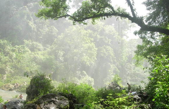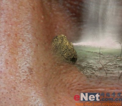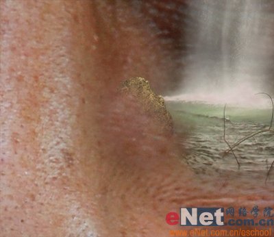 十三步:下面對水流部分就行修飾。首先使用柔性的黑色筆刷將水周圍的巖石隱藏掉。然后選用透明度較低的大直徑筆刷沿著水流方向上下涂抹,目的是得到水流的半透明效果,將水流后面人物的臉部顯示出來,效果見下圖。