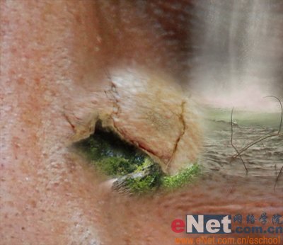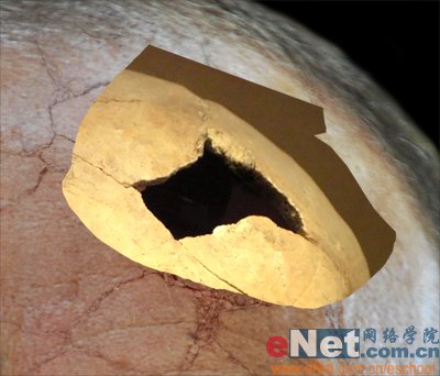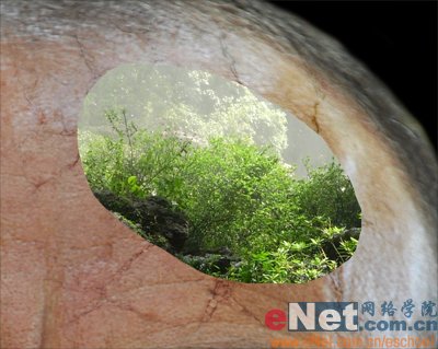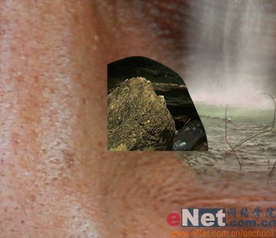 第十六步:新建一層,在工具箱中選擇【仿制圖章工具】(記得在選項欄中要選擇【用于所有圖層】選項),按住【alt】鍵選擇“源”(觀看下圖你會注意到,我選擇的就是洞口周圍的部分),然后再巖石的周圍繪制,變換該層的大小及位置,效果見下圖。