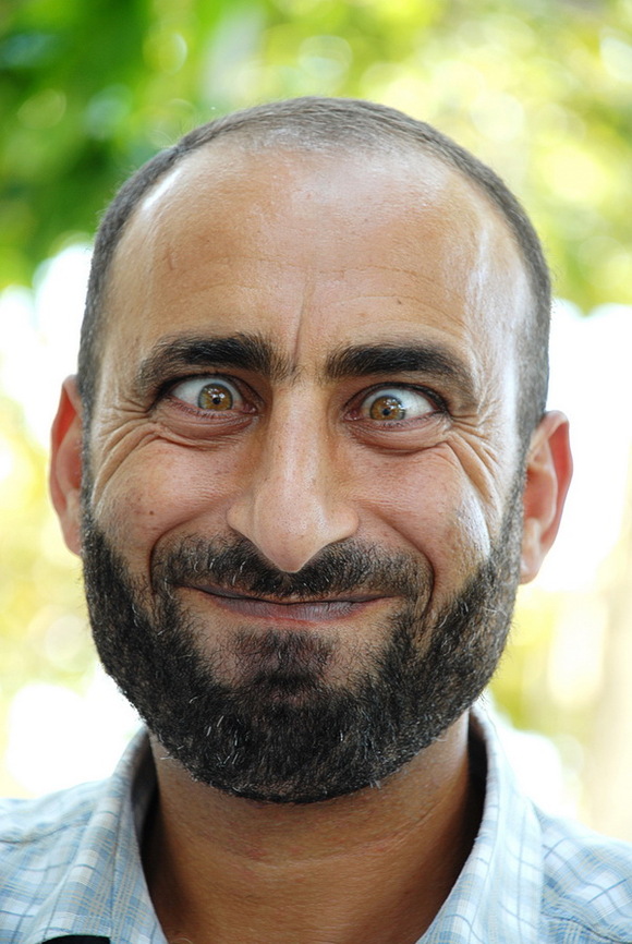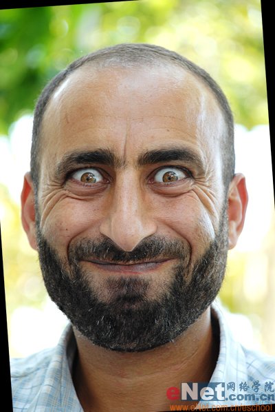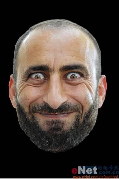 第二步:點擊圖層調板下方的【添加矢量蒙版】按鈕,為【人物】添加蒙版,然后使用黑色的柔性筆刷在蒙版上涂抹,只留下人物的頭部,效果見下圖。其實這里就樣做的目的就是要將人物的頭部扣出來,大家也可以使用其它的摳圖方法。(林棲者語:如果你仔細觀察下面的圖片,會發現它和上面的素材圖略有不同——眼睛的瞳孔和虹膜位置發生了些許的改變。在原作中,作者花了6步才完成這個操作。很顯然原作者是個完美主義者,但我實在不想考驗大家的耐心,所以跳過了這幾步,直接講解后面精華的部分。當然在你看到本文的第十六步時,也許已經知道作者是如何移動瞳孔的位置的了。其實就是新建一層,然后采用【仿制圖章工具】進行復制,這也是“換臉術”中經常使用的方法。)