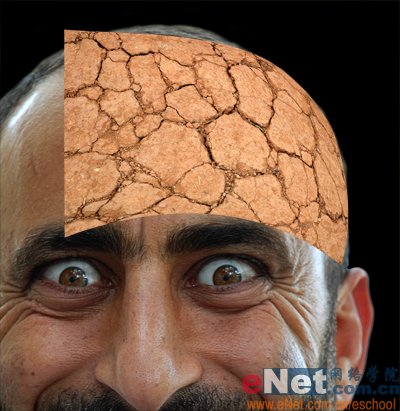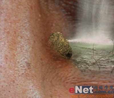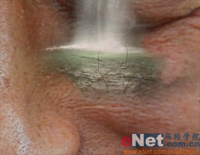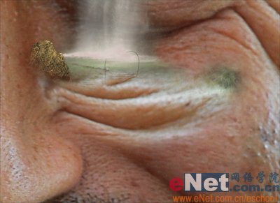 第十八步: 下面我打算將臉部的皮膚“變形”,制作出一種仿佛水流從一個小孔流入臉部的效果。首頁新建一層,然后使用【仿制圖章工具】,復制臉頰左側褶皺的皮膚,按【ctrl+t】鍵對其進行旋轉,執行【編輯—變換—變形】命令對其進行變形,得到下面所示的效果。