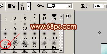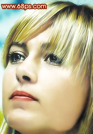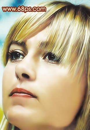 8、新建一個圖層,蓋印圖層,選擇涂抹工具,再選擇一個點狀的畫筆,壓力40%左右,然后順著人物的頭發涂抹,需要有耐心,效果如圖13。