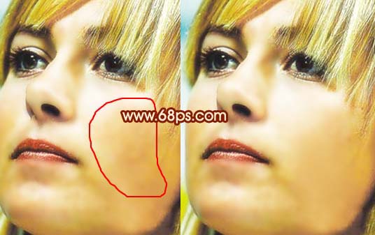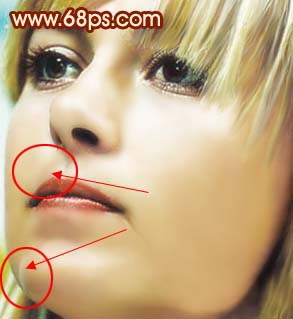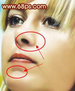 <圖13> 9、選擇減淡工具把下圖下面圈中的反光部位涂亮一點,再用加深工具把上圈的暗部加深一點。