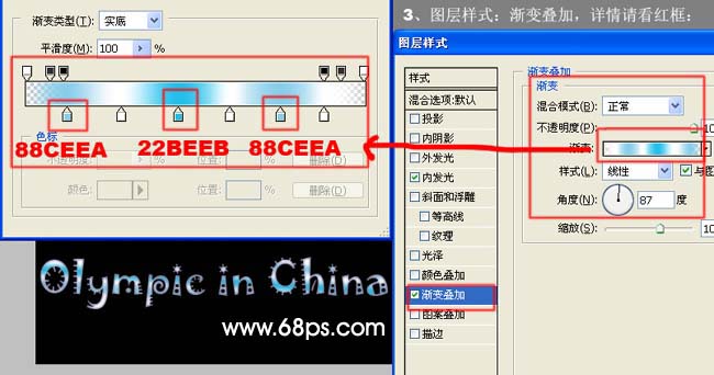 3、漸變疊加參數(shù)設(shè)置。4、描邊參數(shù)設(shè)置。5、用畫筆刷一些上光筆刷,完成最終效果。
