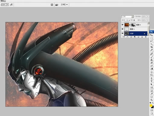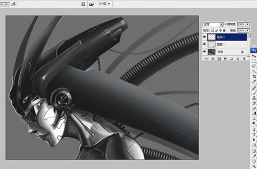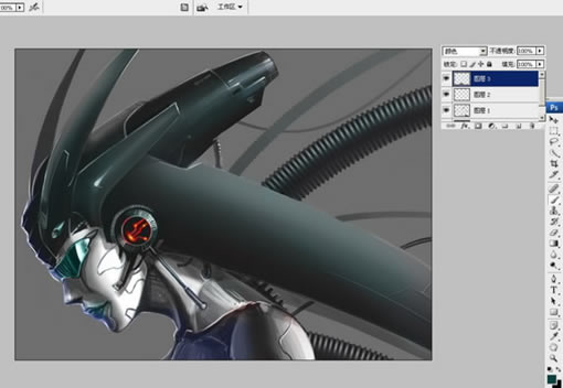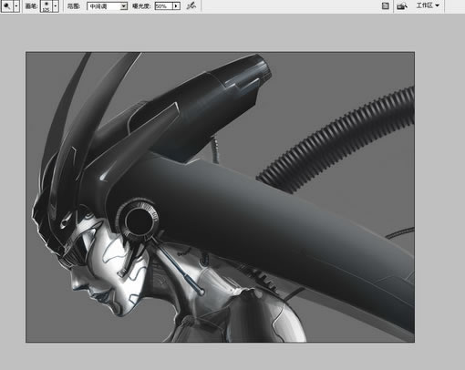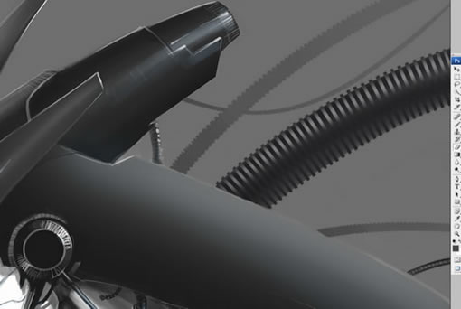 5、為機械加上一些連接的管子,豐富畫面。做管子的方法:先畫出管子的彎曲方向,然后畫出一排平行的直線,執行變換,做出弧度。再對管子進行加深減淡,使之有立體感。