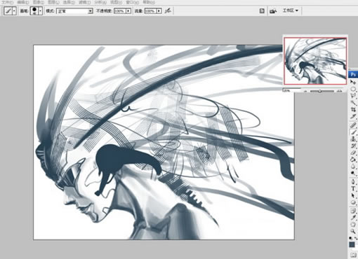 1、繪制草稿。直接用大直徑筆刷塑造面。這一步可以隨意些,只要自己能分辨出各個部分是什么就可以。這里我打開了導航器,這樣方便觀察整體。