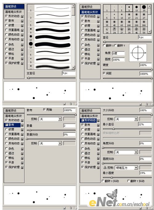 16.下面我們來制作一些星星。建立一新圖層并用黑色填充再重命名為b stars,設置圖層混合模式為顏色減淡。之后選擇畫筆工具對其做一下設置在圖中編輯出如下所示的星星。