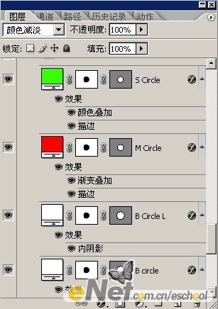3.重復第1.2步驟用橢圓選框工具另外建立2個圖層將2個圖層的顏色分別設置成為綠色和紅色。將這個2個圖層分別重命名為m circle和s circle。