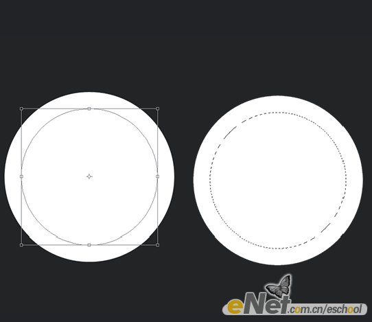 1.建立一新文檔,用深灰色填充背景層。在文檔的水平居中位置用橢圓工具建立一正圓選區并用白色填充選區再將其重命名為 b circle。