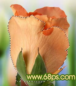 4、回到剛才勾出的花朵圖層,用鋼筆工具把最外面的一塊花瓣勾出來,按ctrl + j復(fù)制到新的圖層,暫時(shí)關(guān)掉圖層面板上的眼睛把這一塊花瓣隱藏起來。
