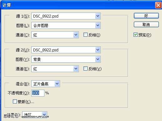 3、把文件保存一下,然后記住文件名稱,執行:圖像 > 計算(部分版本為運算),參數設置如下圖,確定后會得到一個選區,然后按ctrl + shift + i反選,保持選區不變。